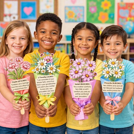This flower bouquet craft bundle comes in 5 designs. Each unique flower bouquet craft includes a special Bible verse just for Mom!