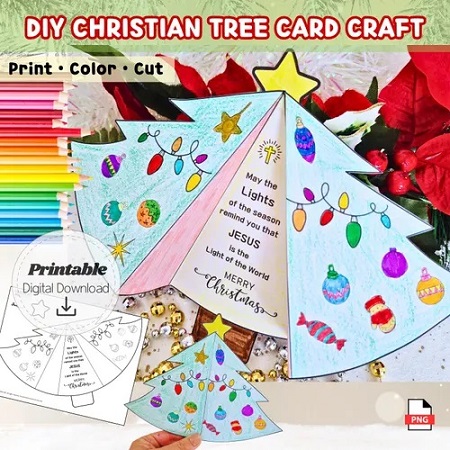This printable coloring card and craft for kids is designed in a Christmas tree shape.